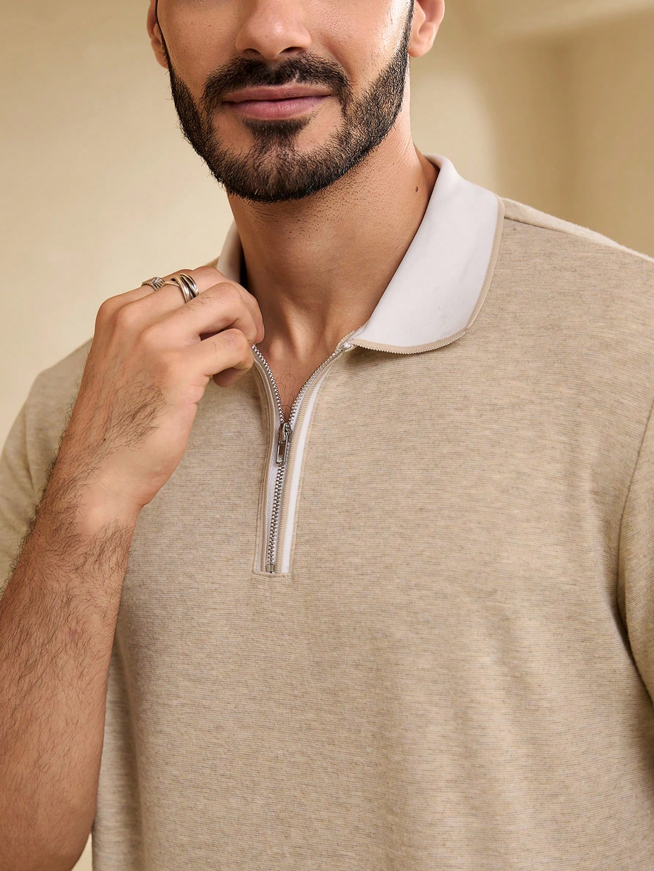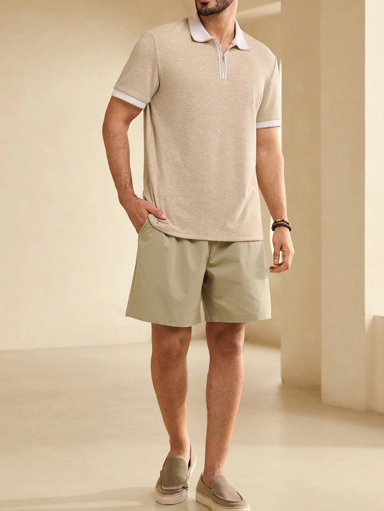 Manfinity KASUA Men??s Color Block Zipper Polo Shirt And Pocketed Drawstring Shorts Summer Casual Outfit